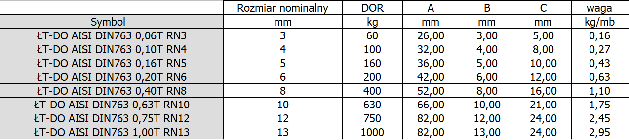 Charakterystyka łańcucha technicznego DIN 763 z ogniwem długim, nierdzewnego AISI: