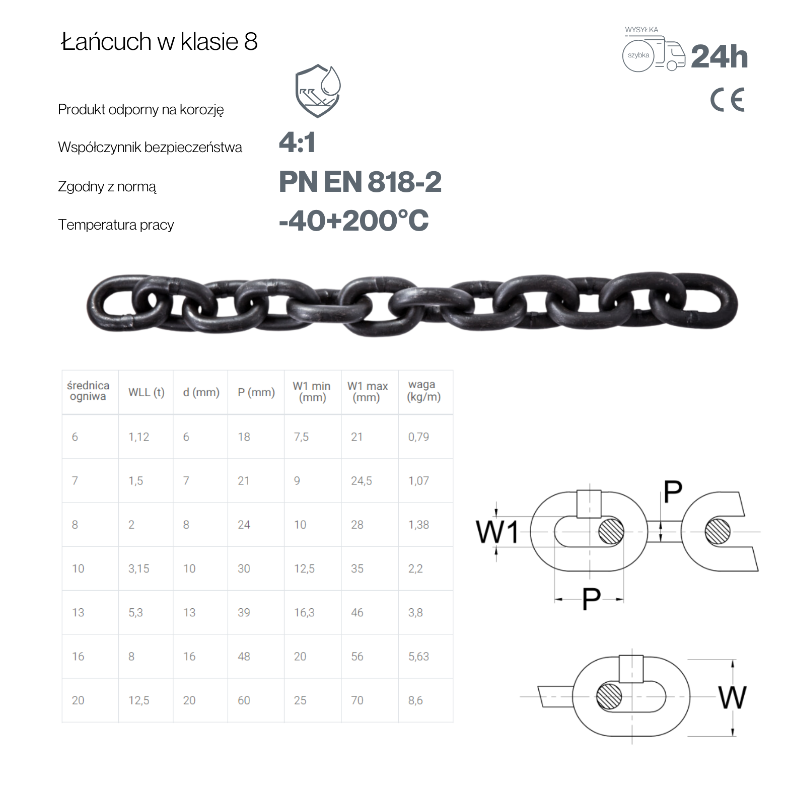 Produkty te są zgodne z europejską normą EN 818-2, która określa standardy dotyczące wytrzymałości, wymiarów i tolerancji łańcuchów przeznaczonych do podnoszenia ładunków. Klasa 8 to najwyższy standard w tej kategorii, co gwarantuje użytkownikom najwyższy poziom bezpieczeństwa oraz pewność, że łańcuchy te spełniają najbardziej rygorystyczne wymagania przemysłowe. -