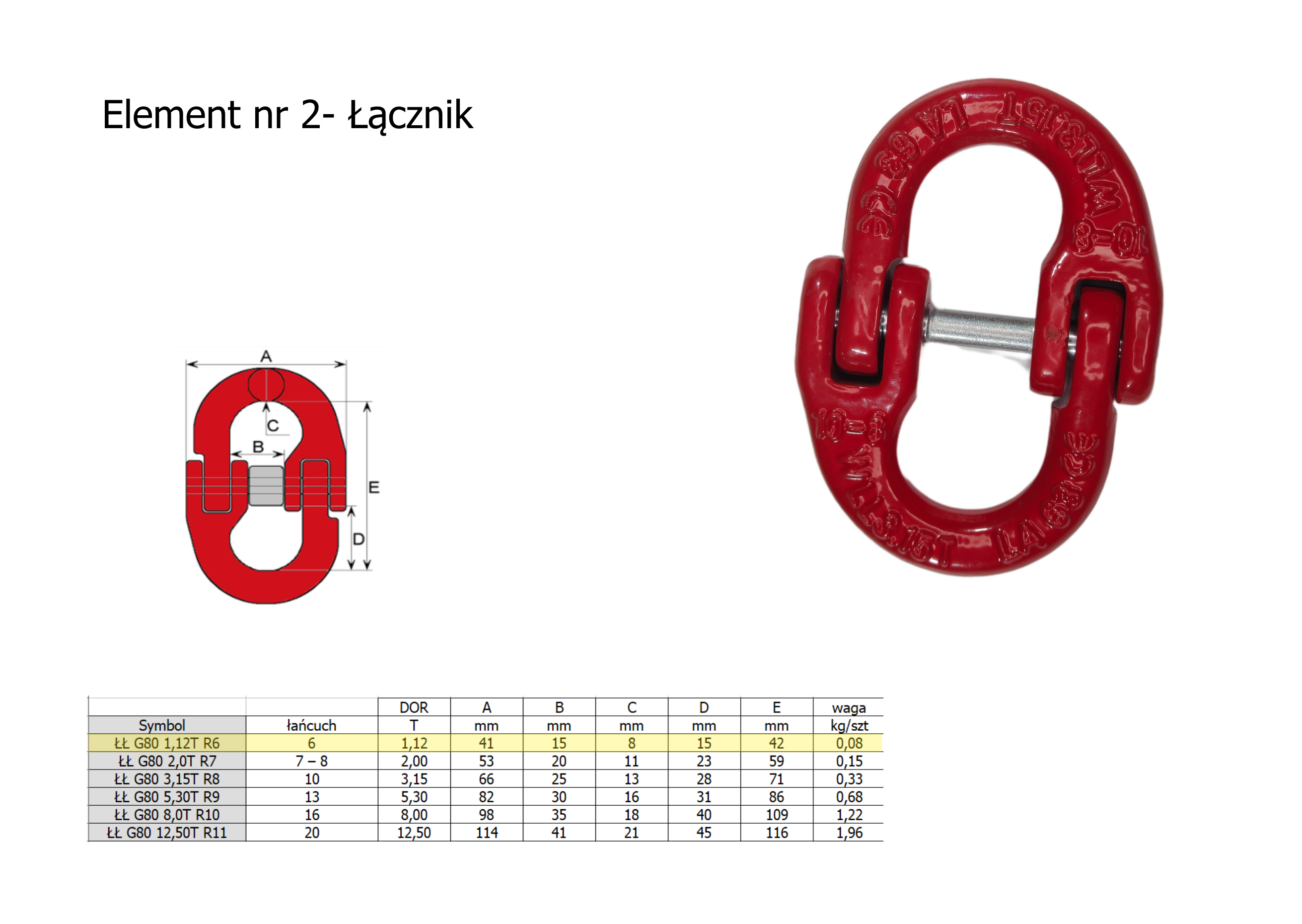 - Cięgno (łańcuch) – wykonane ze stali o wysokiej wytrzymałości, w standardzie klasy 8.