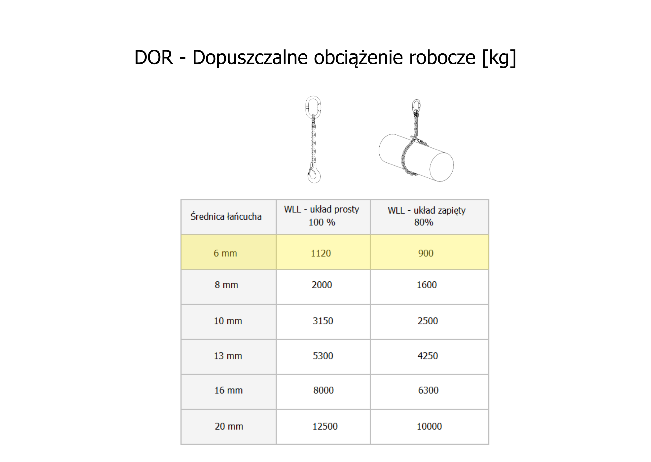 Zawiesia łańcuchowe jedno-cięgnowe mogą mieć różne dopuszczalne obciążenia robocze (WLL - Working Load Limit) w zależności od klasy łańcucha i jego średnicy: