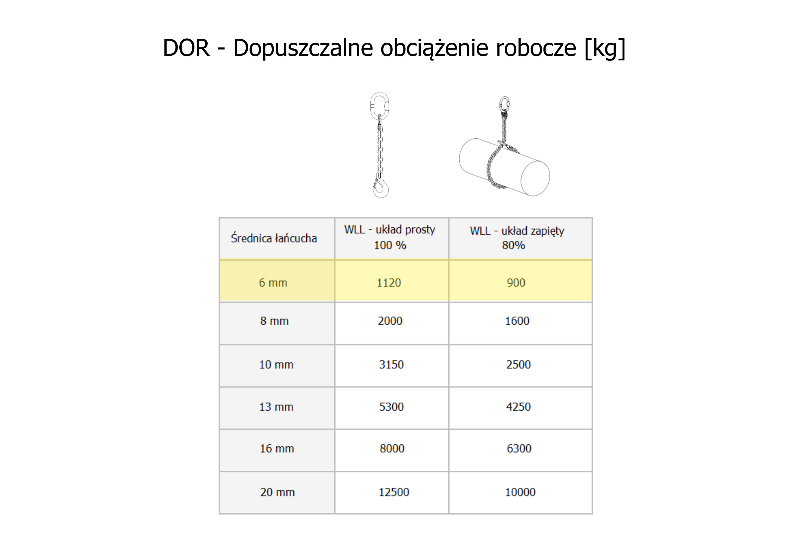 Zawiesia łańcuchowe jedno-cięgnowe mogą mieć różne dopuszczalne obciążenia robocze (WLL - Working Load Limit) w zależności od klasy łańcucha i jego średnicy: