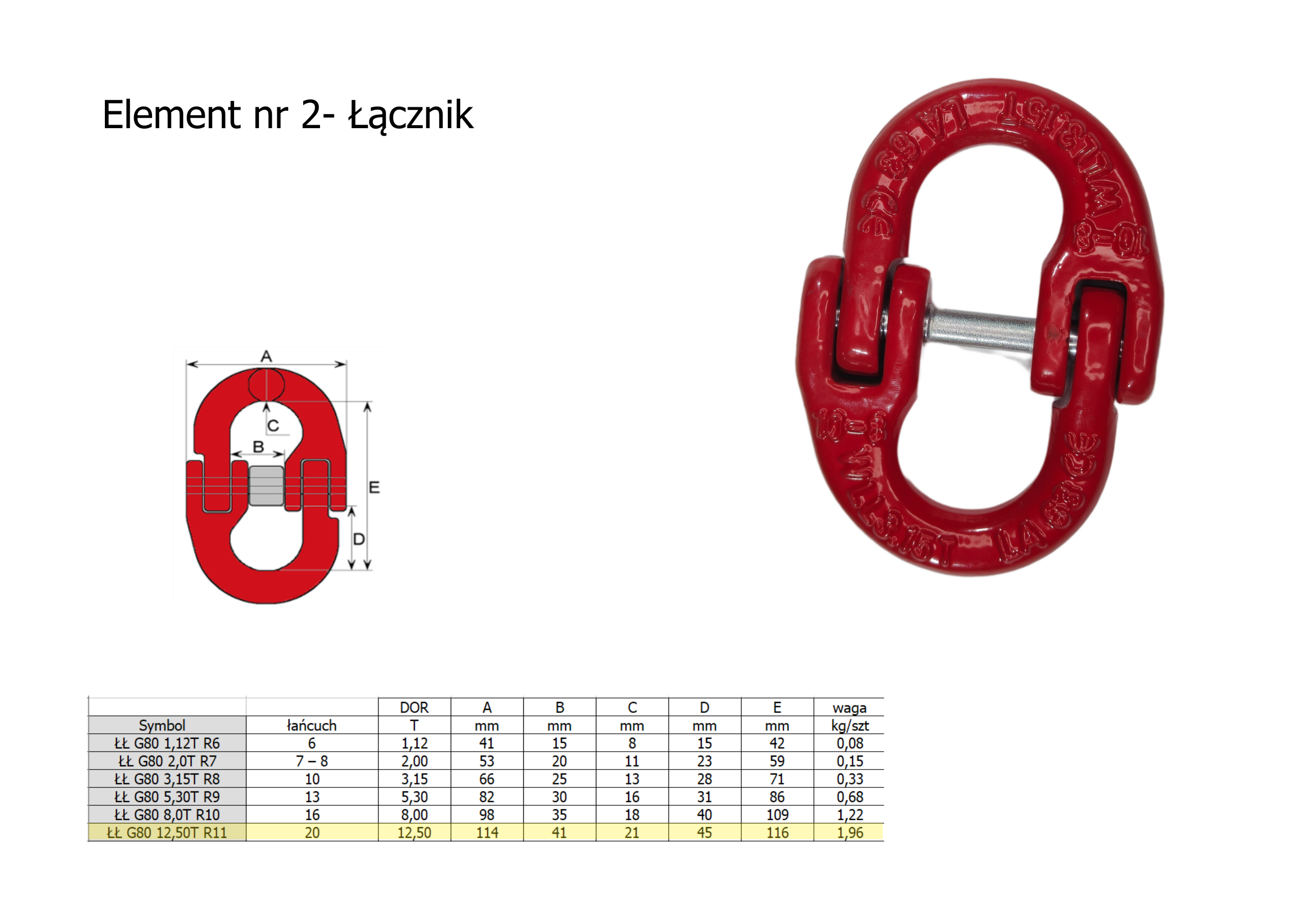- Cięgno (łańcuch) – wykonane ze stali o wysokiej wytrzymałości, w standardzie klasy 8.