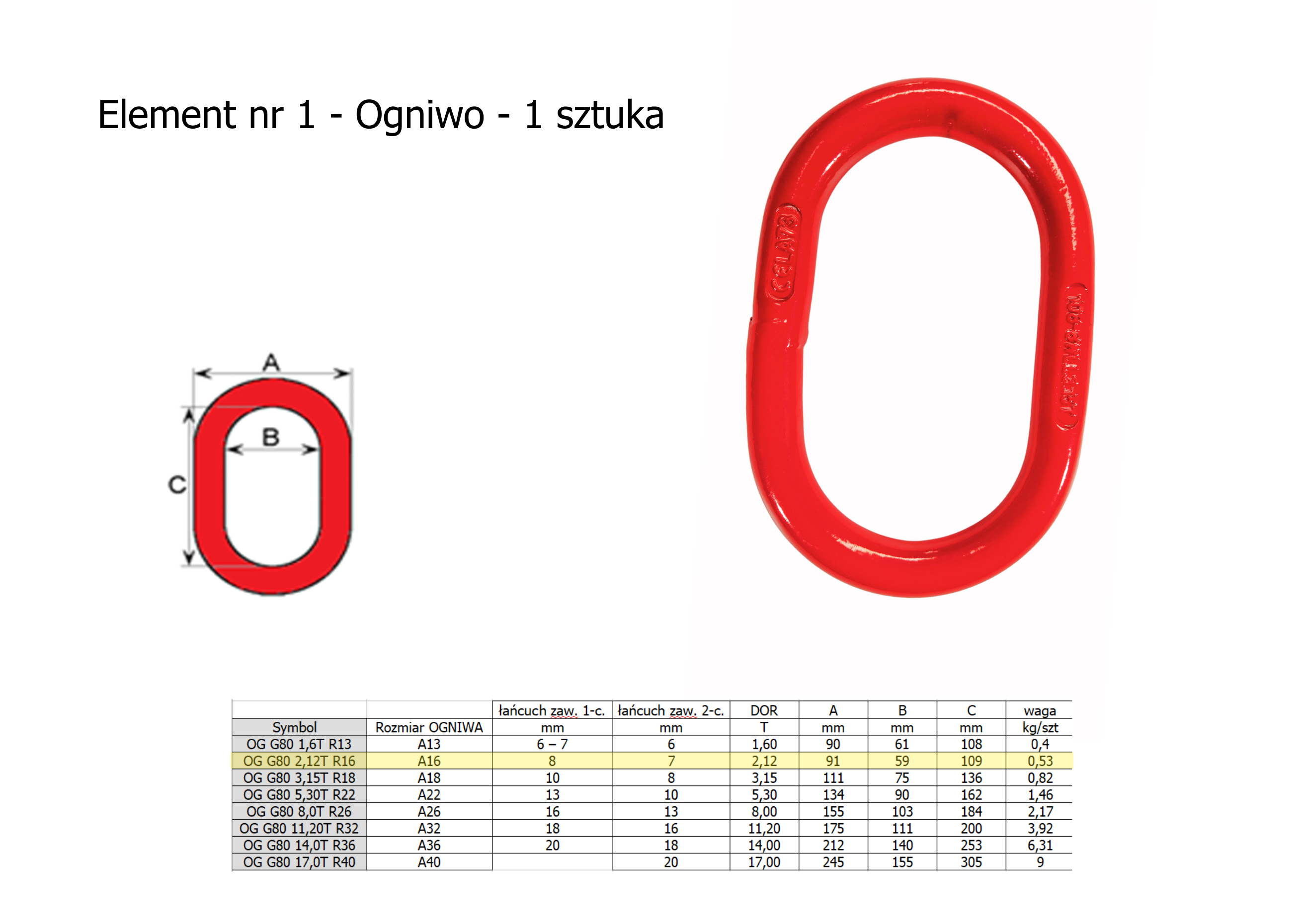 - Ogniwo zbiorcze (górne ogniwo) – służy do połączenia zawiesia z urządzeniem podnoszącym (żuraw, suwnica).