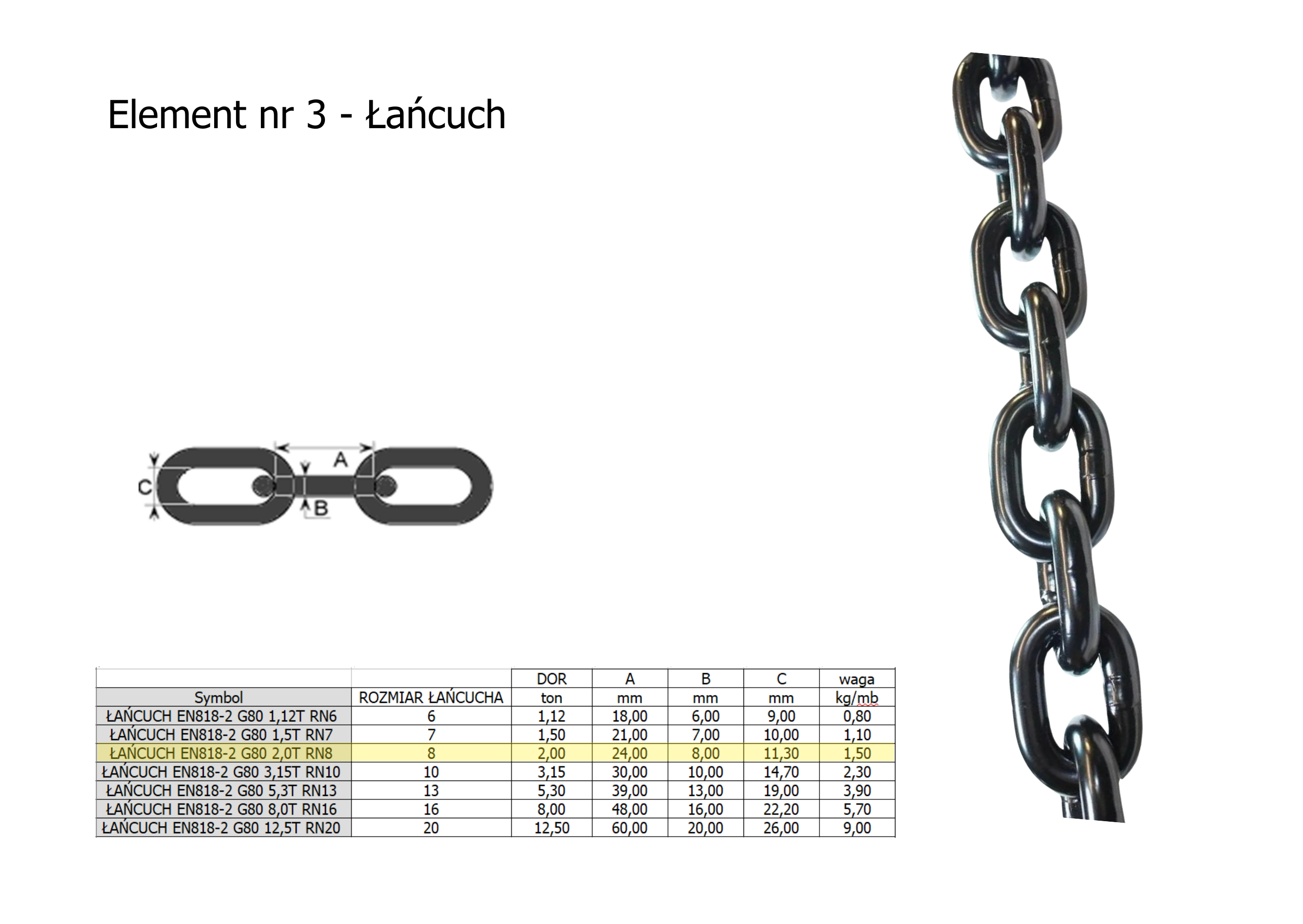 - Cięgno (łańcuch) – wykonane ze stali o wysokiej wytrzymałości, w standardzie klasy 8.