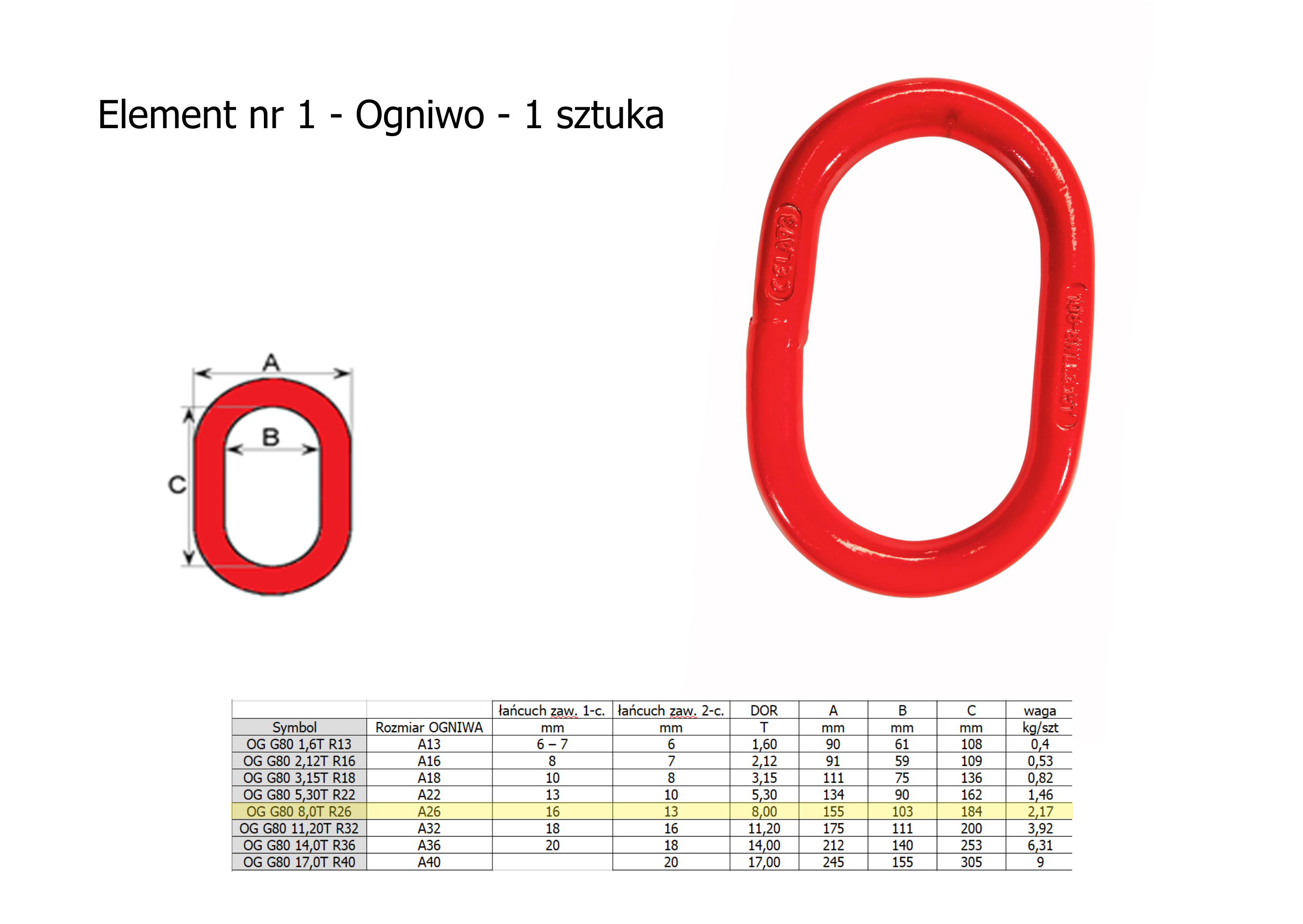 - Cięgno (łańcuch) – wykonane ze stali o wysokiej wytrzymałości, w standardzie klasy 8.