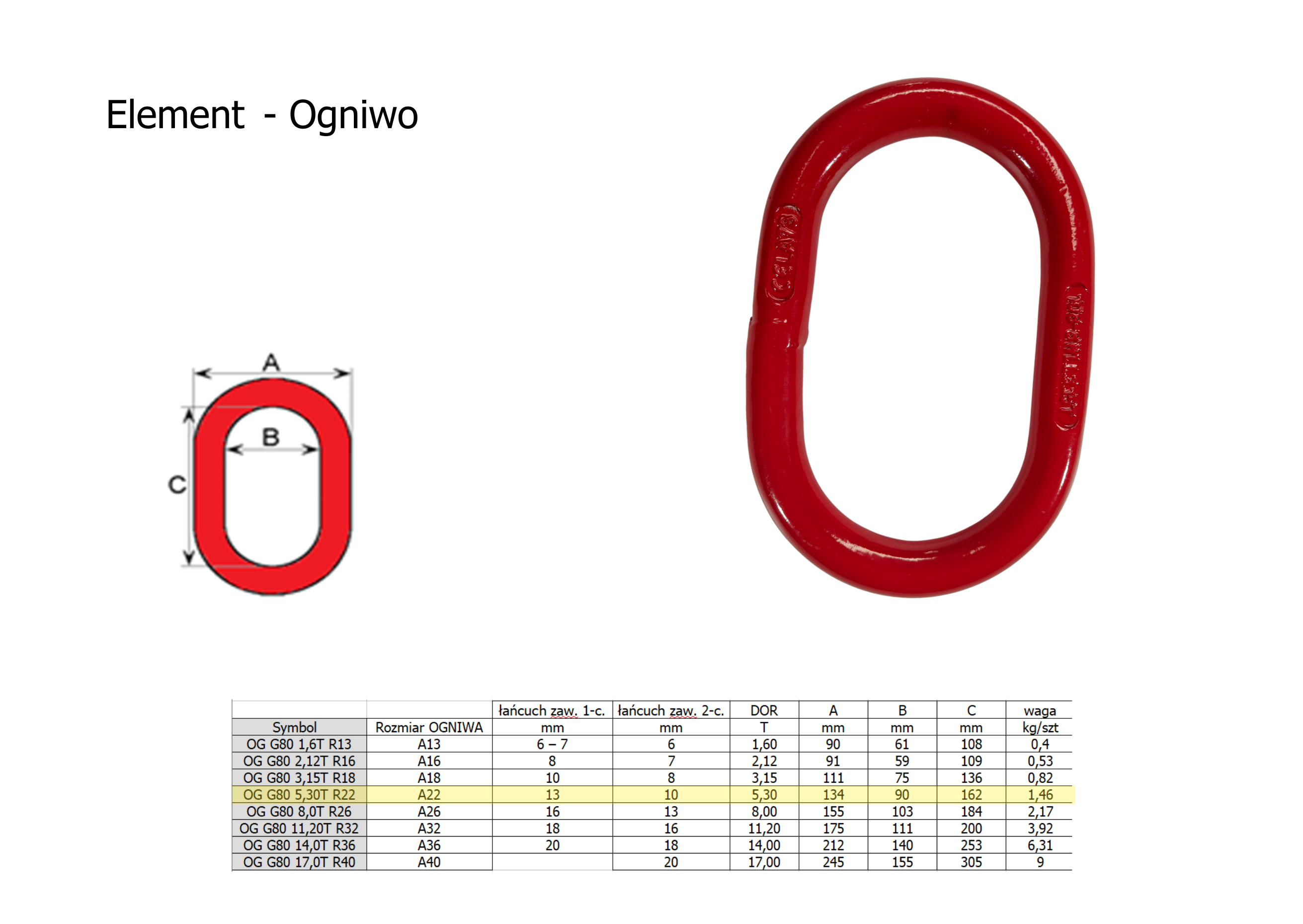 - Ogniwo zbiorcze (górne ogniwo) – służy do połączenia zawiesia z urządzeniem podnoszącym (żuraw, suwnica).