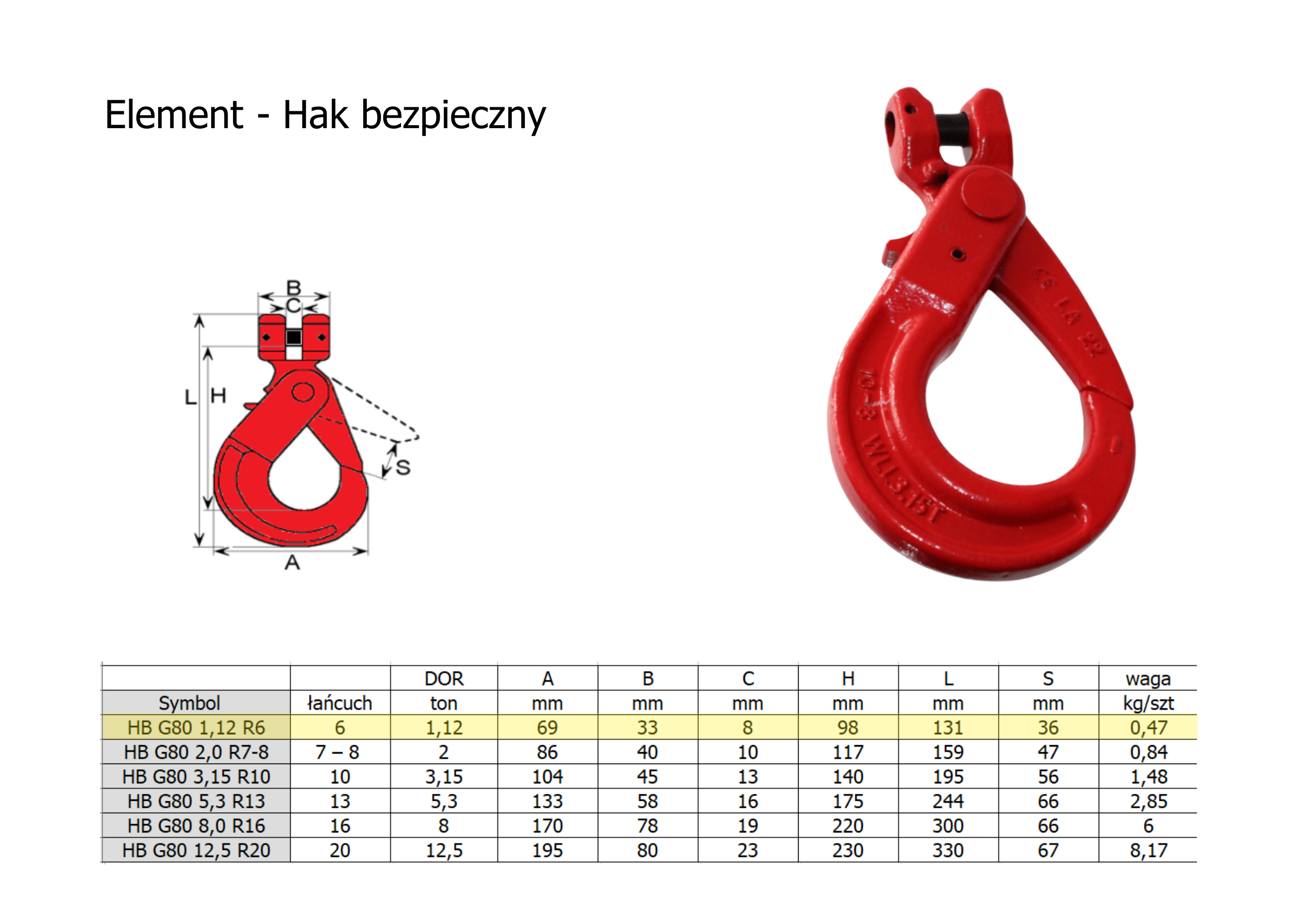 - Hak roboczy – na końcu zawiesia, którym bezpośrednio chwyta się podnoszony ładunek (dostępne kilka wariantów).