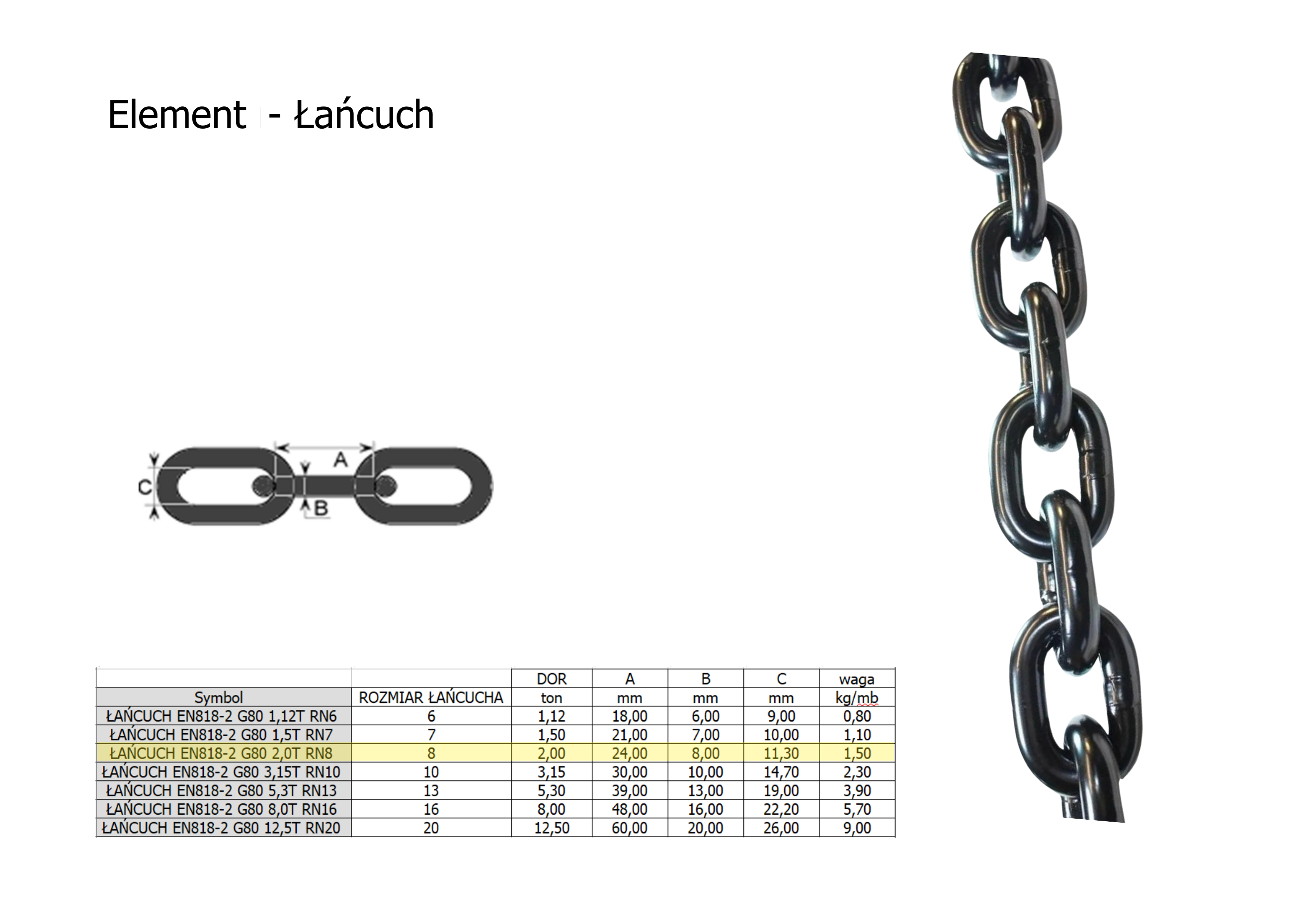- Cięgno (łańcuch) – wykonane ze stali o wysokiej wytrzymałości, w standardzie klasy 8.