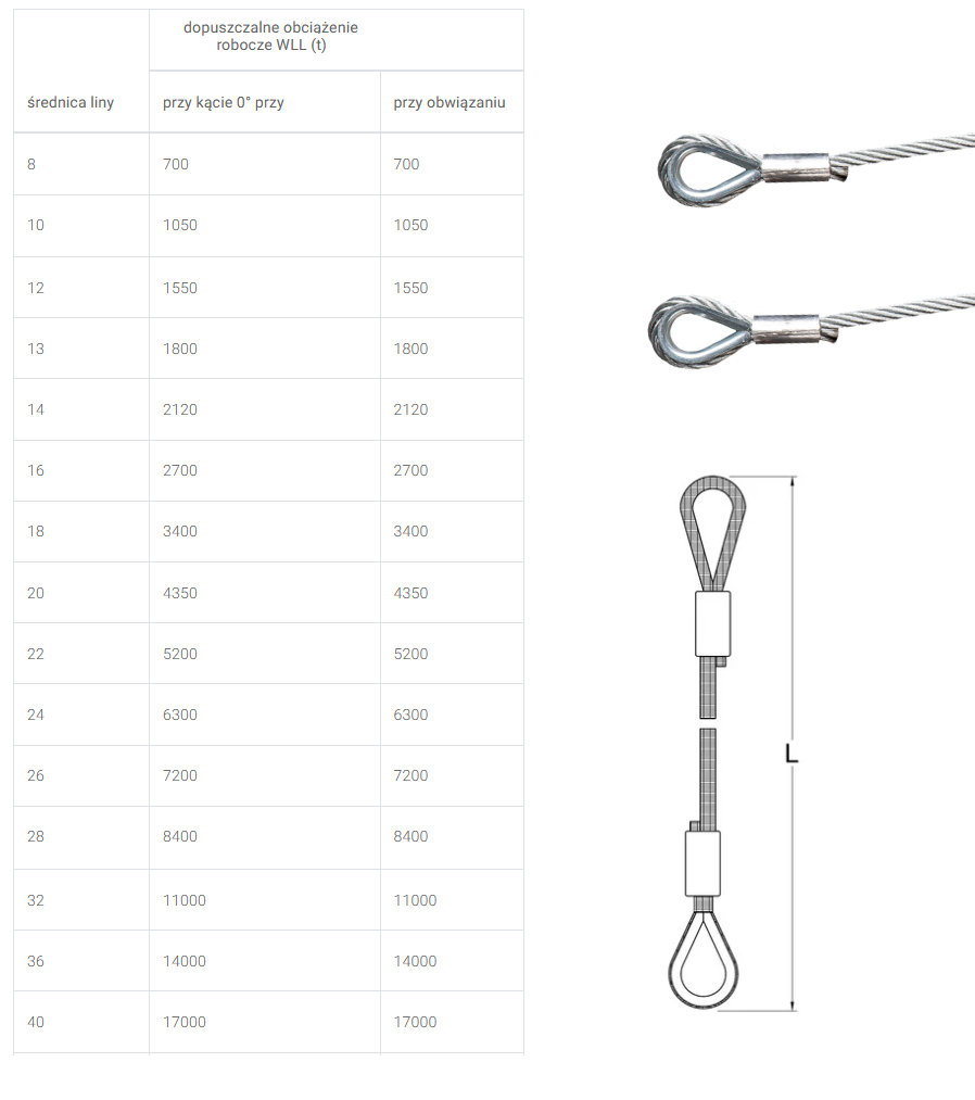 Łatwość montażu i użytkowania – kausze na końcach ułatwiają szybkie mocowanie do haków, zaczepów lub innych elementów dźwigowych.