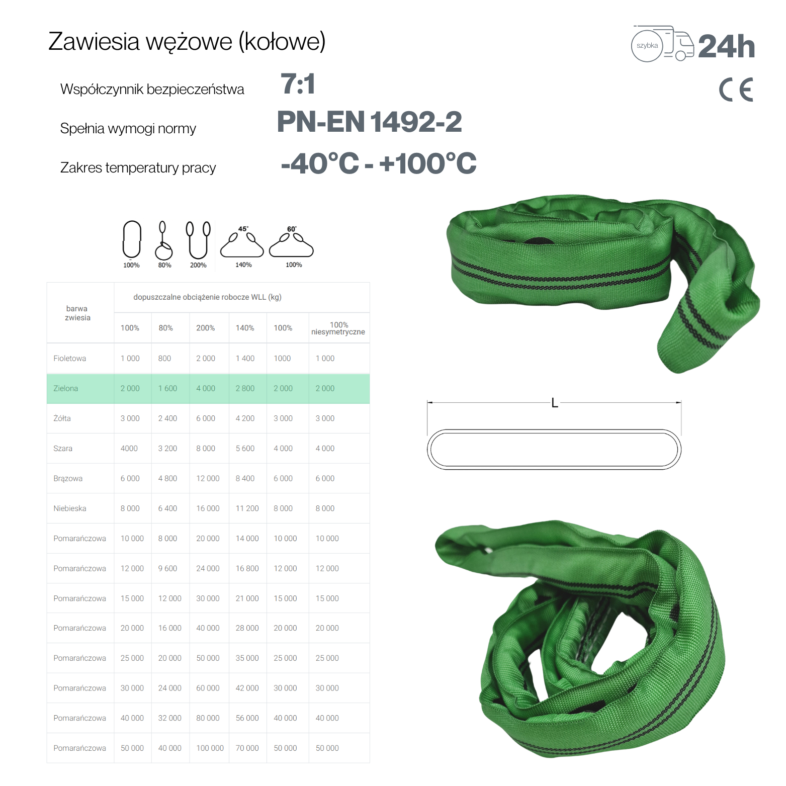 - Certyfikacja: Wszystkie zawiesia posiadają atesty potwierdzone Certyfikatem Jakości oraz metką zgodności z normą EN 1492-2:2000.