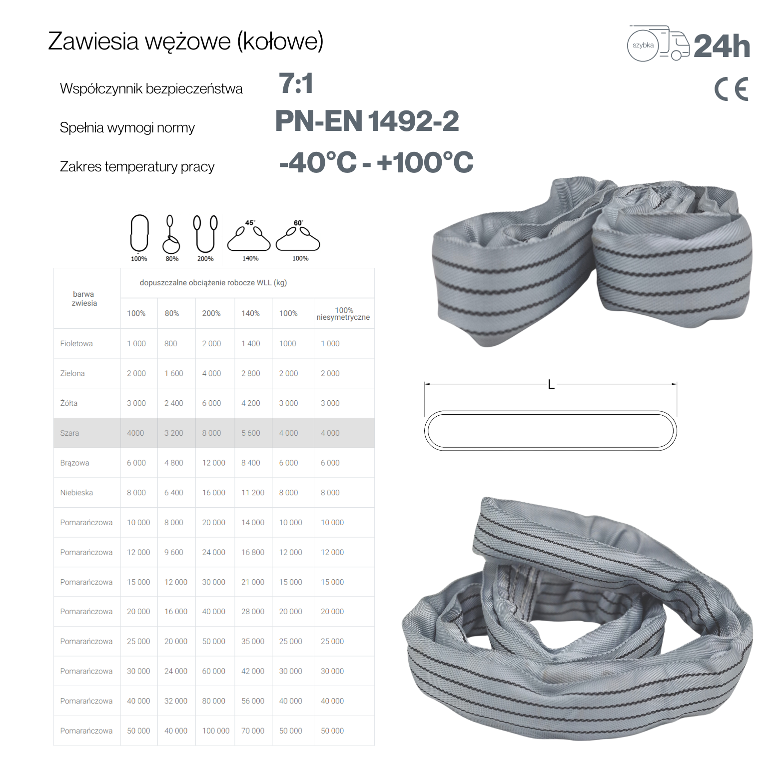 - Certyfikacja: Wszystkie zawiesia posiadają atesty potwierdzone Certyfikatem Jakości oraz metką zgodności z normą EN 1492-2:2000.