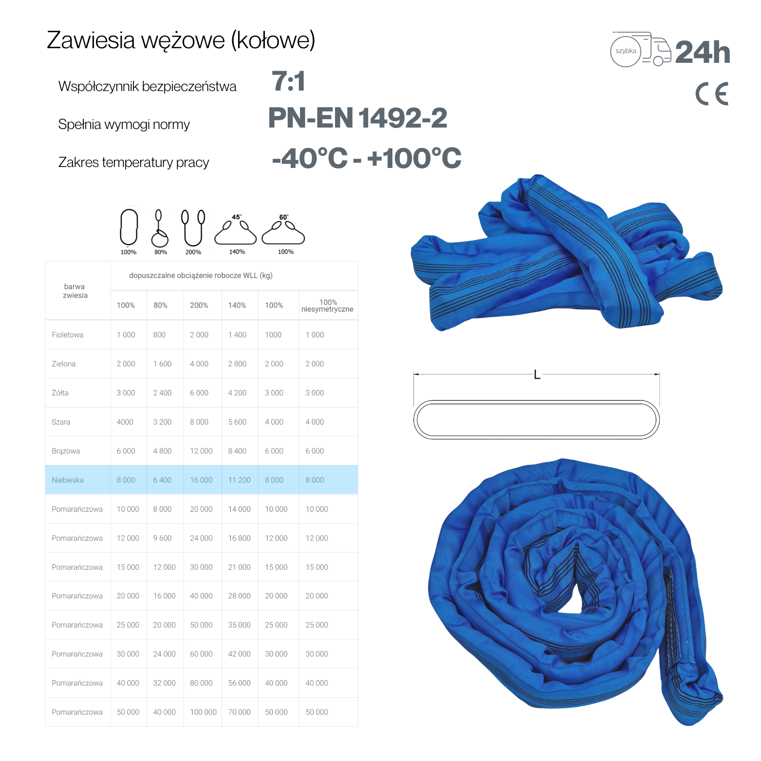 - Certyfikacja: Wszystkie zawiesia posiadają atesty potwierdzone Certyfikatem Jakości oraz metką zgodności z normą EN 1492-2:2000.